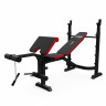 Расстояние между стойками скамьи составляет 63 сантиметра, что позволяет использовать большинство видов штанг. Угол наклона скамьи регулируется, что дает возможность выполнять различные виды жима лежа и другие упражнения.